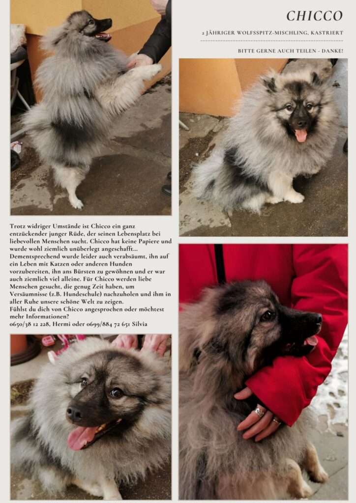 Chicco kommt von einem Vermehrer, hat keine Papiere und wurde wohl ziemlich unüberlegt angeschafft. Dementsprechend wurde leider auch verabsäumt, ihn auf ein Leben mit Katzen oder anderen Hunden vorzubereiten, ihn ans Bürsten zu gewöhnen und er war auch ziemlich viel alleine.